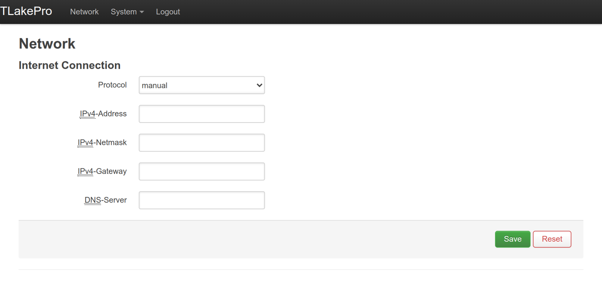 В форме можно выбрать либо вариант подключения “automatic”. В этом случае БС запросит параметры подключения к интернет по протоколу DHCP. Либо можно выбрать вариант “manual”, в этом случае нужно будет заполнить значения “IPv4-Address”, “IPv4-Netmask”, “IPv4-Gateway”, “DNS-Server”. После настройки новых параметров web интерфейс может стать недоступен. Для повторного входа может понадобиться настроить IP связность с учётом новых настроек на БС.